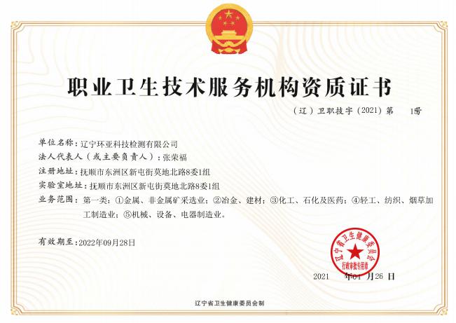 遼寧環(huán)亞科技檢測有限公司秉承“公平、公正、客觀、真實”的服務(wù)理念,力求為遼寧省各企事業(yè)等用人單位提供更優(yōu)質(zhì)的服務(wù),公司領(lǐng)導(dǎo)率領(lǐng)全體員工歷時一年零八個月的時間操練各項基本技能,于2016年8月9日取得了(遼)安職技字(2016)第B-0019號《職業(yè)衛(wèi)生技術(shù)服務(wù)機(jī)構(gòu)資質(zhì)證書》